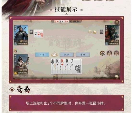 当连续三次打出相同牌型时,蔡文姬会触发【和弦】技能,将手牌中的最小牌随机变大;而当连续三次打出不同牌型时,则触发【变奏】技能,弃置一张最小牌。这种机制使得蔡文姬在牌局中能够灵活地调整手牌,以适应不同的局势。
