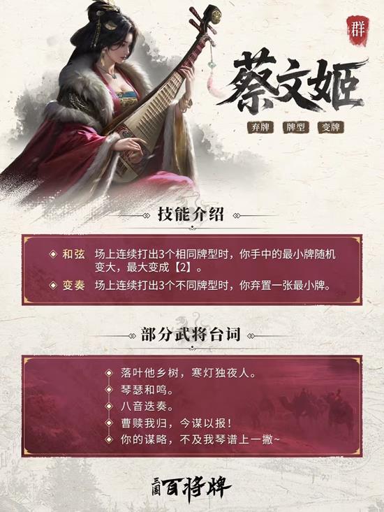 而当连续三次打出不同牌型时,则触发【变奏】技能,弃置一张最小牌。这种技能机制使得蔡文姬能够在牌局中灵活调整手牌,以适应不断变化的局势。