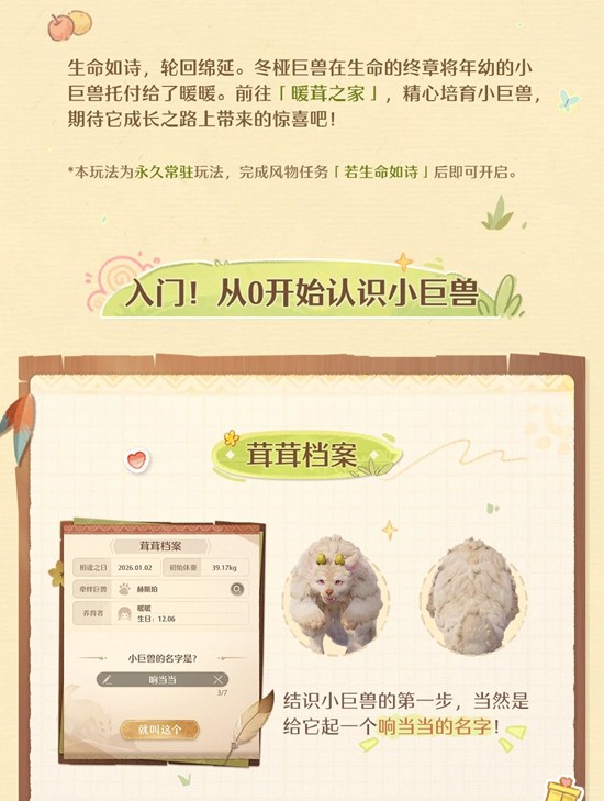 无限暖暖2.1新版本「巨兽养成计划」永久常驻玩法现已上线~本玩法为永久常驻玩法,完成风物任务「若生命如诗」后即可开启。请查收这篇小巨兽的养成科普(o゚v゚)ノ,从居住环境到日常生活全面了解小巨兽,期待它成长之路上带来的惊喜吧!一起来和小编看看吧~