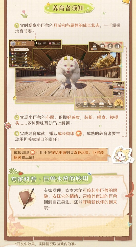 专家发现,吹奏木笛可唤起小巨兽的跟随,安抚它的情绪,召唤养育过的巨兽回到自己身边,还能呼唤新伙伴的到来哦~
