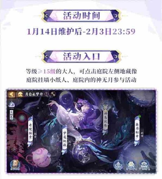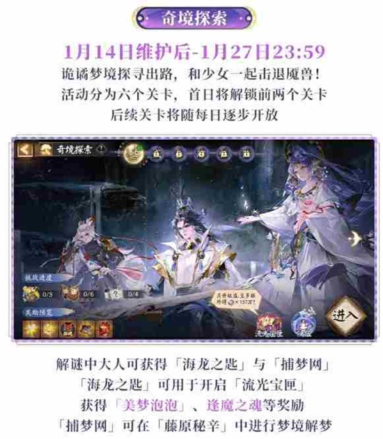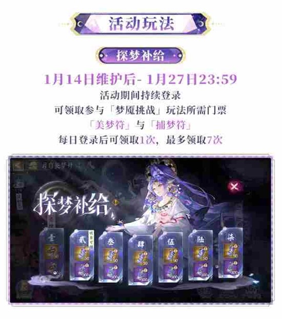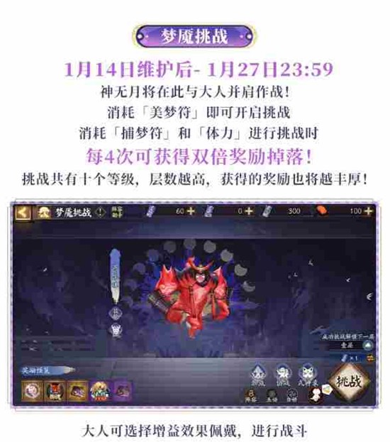 14日-27日持续登录7天额外领10张「美梦符」,助力一键扫荡高层梦魔;1月21日还将追加首领BOSS「神鸟试炼」,通关掉落御魂、大蛇逆鳞,为春节御魂强化提前蓄能。