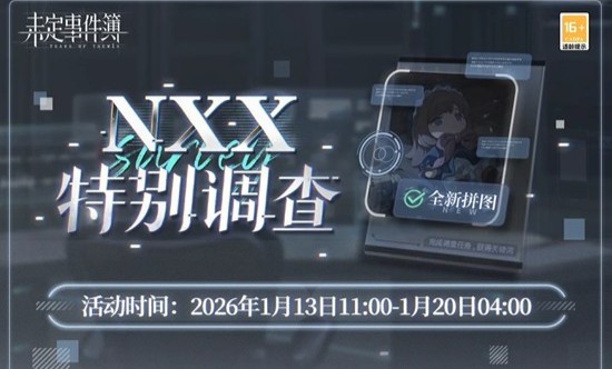 以上就是未定事件簿「NXX特别调查」限时活动1月13日现已开放的全部内容了,更多游戏资讯,攻略内容敬请关注切游网,您的支持是我们努力的动力!