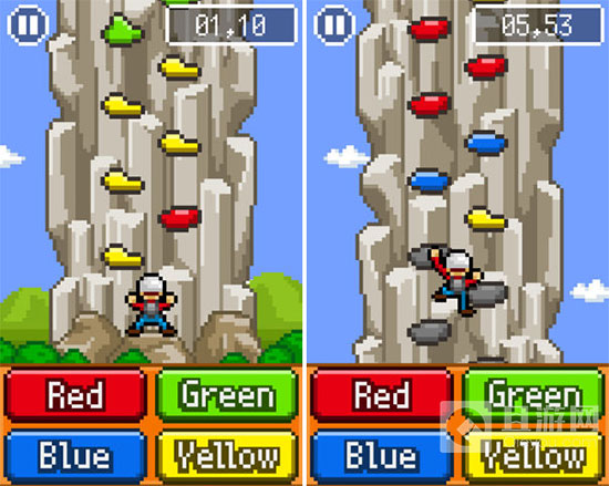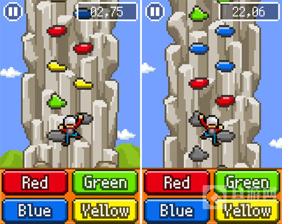 不过要是按到跟岩石不同颜色的话就会马上结束游戏,所以一刻都不能大意。顺利到达最顶端的话,过关时间就会以分数记录下来。而分数也有对应游戏排行中心,所以可以跟全国的攀岩者互相竞争。