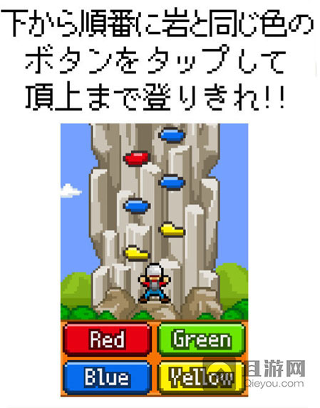 游戏规则非常简单,玩家要从起点开始攀爬,以最上面为目标。而山壁上会有红、蓝、绿、黄4种颜色的使力点壁,画面下方则会有对应4种颜色的按钮,玩家要从下方按照顺序来按语岩石相同颜色的按钮攀爬。