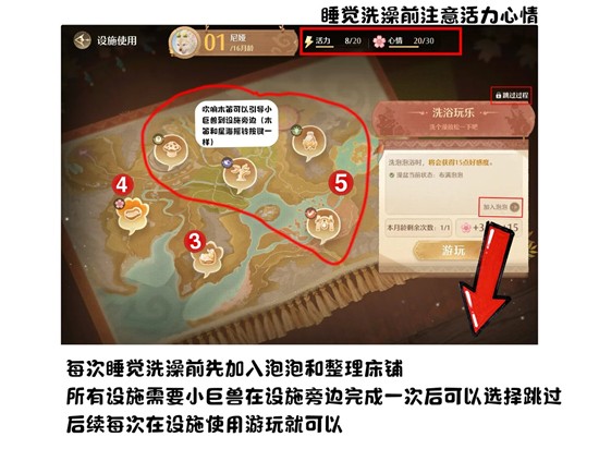 互动→投喂→洗浴→睡觉→游玩设施→日程安排