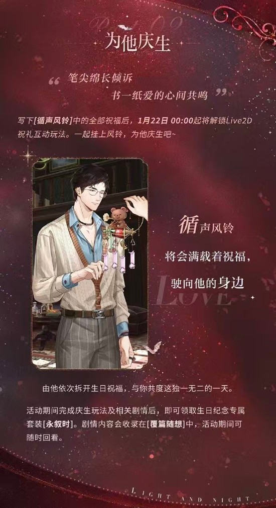 写下[循声风铃]中的全部祝福后,1月22日 00:00起将解锁Live2D祝礼互动玩法。一起挂上风铃,为他庆生吧~