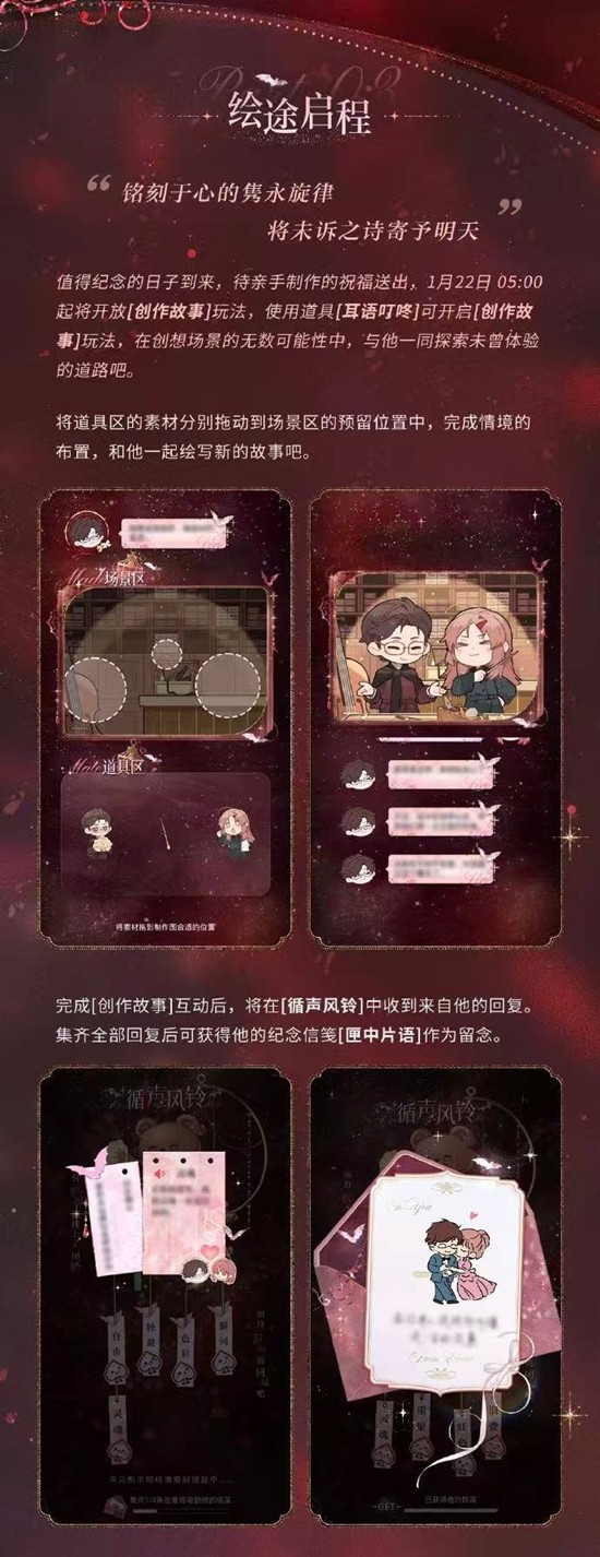 值得纪念的日子到来,待亲手制作的祝福送出,1月22日05:00起将开放[创作故事]玩法,使用道具[耳语叮咚]可开启[创作故事]玩法,在创想场景的无数可能性中,与他一同探索未曾体验的道路吧。