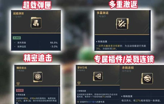 通过刷副本即可获得的死亡猎手,是一把以高单发伤害著称的精准打击型武器。推荐搭配多重激返、精密追击、专属插件以及杀戮连锁。这套组合能有效避免频繁换弹打断输出节奏,确保每一发子弹的威力。多重激返增强了子弹的穿透能力,应对群体敌人时更加灵活,而精密追击则提升了远距离射击的命中率。