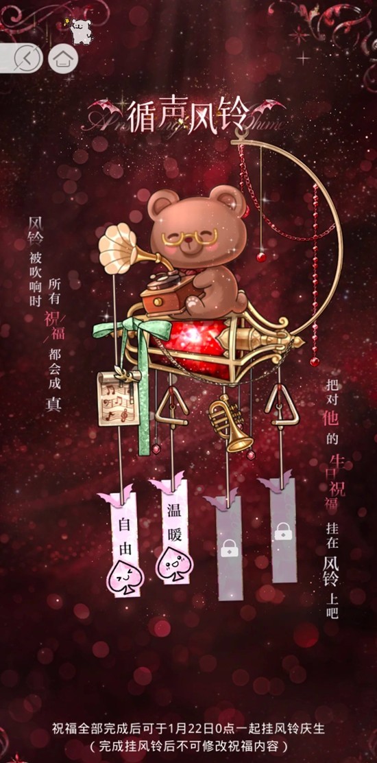 预计活动第五天凌晨12点(第四天最后一分钟后)挂完风铃可拿到活动专属衣服[永叙时]
