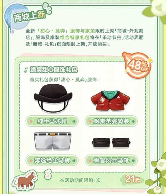 活动期间,全新「甜心·莫弈」服饰与家装限时上架「商城-外观商店」,服饰及家装组合特惠礼包将在「乐动节拍」活动界面及「商城-礼包」页面限时上架,开放购买