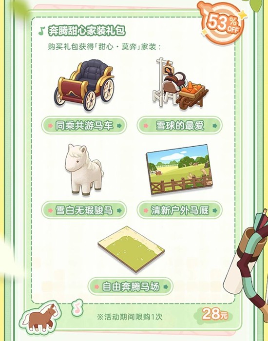 -礼包内容:「甜心·莫弈」家装:同乘共游马车、雪球的最爱、雪白无瑕骏马、清新户外马厩、自由奔腾马场