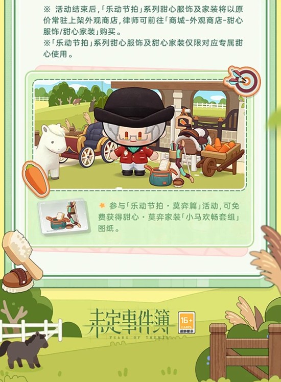 ※初代小贴士:活动结束后,「乐动节拍」系列甜心服饰及家装将以原价常驻上架外观商店,律师可前往「商城-外观商店-甜心服饰/甜心家装」购买。