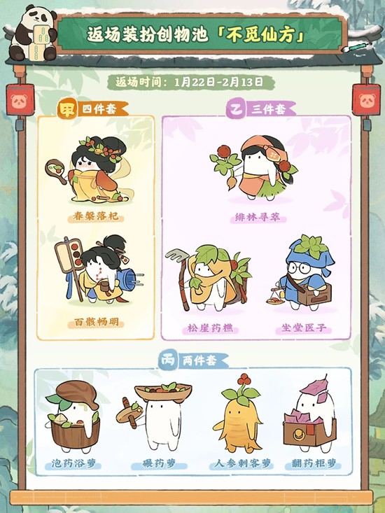 山民们可前往返场装扮创物池抽取两套甲等装扮「百骸畅明」和「春槃落杞」以及三款乙等装扮和四款丙等装扮,用于装扮自己可爱的小萝卜!