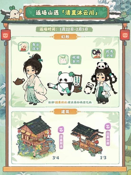 桃源深处有人家冬日烟火人间!「行尽幽篁」创物池将返场~该建筑不仅制作丙等建筑「乘日竹渠」、「斟青山门」,还能解锁三种树木「栖霞枫」、「粉锦木」、「玉髓木」,为「竹澹烟茗」更换藏筠、赤枫、生翠、微胭四种氛围,为「竹澹烟茗」门前的「石刻」更换大熊猫和小熊猫两种形态,更有专属头像框和彩蛋期待大家探索!