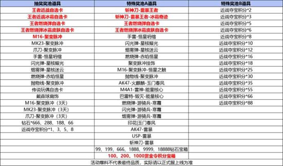 每进行10连抽必触发一次特殊奖池,系统提供A、B两组奖励供2选1,A池主打斩神刀-雷暴王者、王者燃烧弹自选卡、聚变脉冲投掷套、雷暴成套与钻石、赏金令积分箱,B池则集中投放近战夺宝积分,方便缺积分的CFer快速凑齐兑换额度,所有特殊奖池道具直接入库,无需再手动分解。