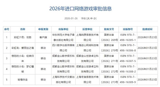 2026年1月264日,国家新闻出版署公布了新一批进口网络游戏版号审批结果,共计5款游戏获批。其中育碧旗下战术射击大作《彩虹六号:攻势》首次过审,成为本轮最大亮点;经典IP《愤怒的小鸟》以两款作品强势回归,加上休闲益智类《秘境夺金》,为本年度进口游戏市场注入强心剂。