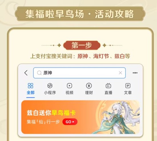 即日起至2月2日22:00,旅行者前往支付宝APP搜索"原神"即可进入早鸟场活动页面,立得3张原神主题早鸟福卡(内含稀有福卡)。正式集福活动将于2月3日0时开启,届时持有的早鸟福卡将自动转换为原神福卡,帮助旅行者快人一步集齐福气。