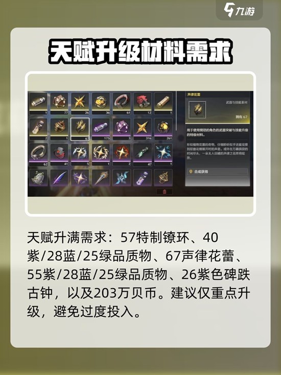 技能升级同样需要大量贝币与隧花声核系列材料,品质需求与突破时相同。忆中沉金用于前期天赋提升,而偏振体系列则是高阶消耗品,包括残翼偏振体、单翼偏振体、多翼偏振体和叠翼偏振体四种,需求量随技能等级递增。