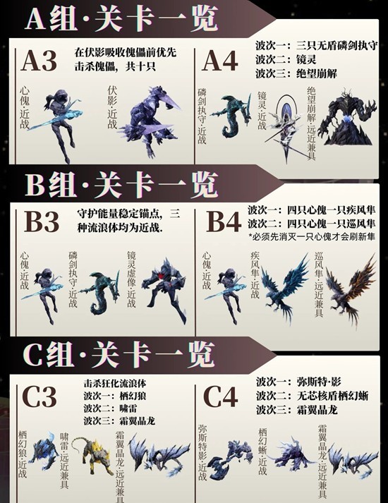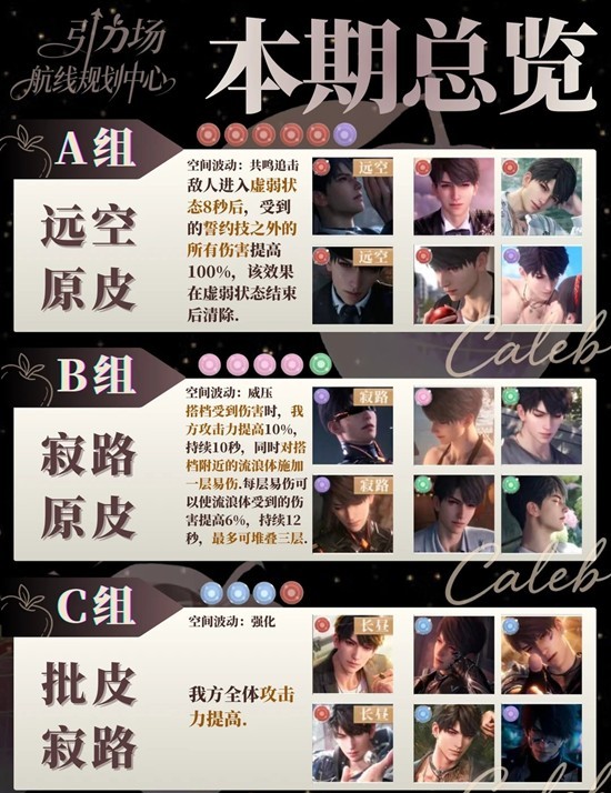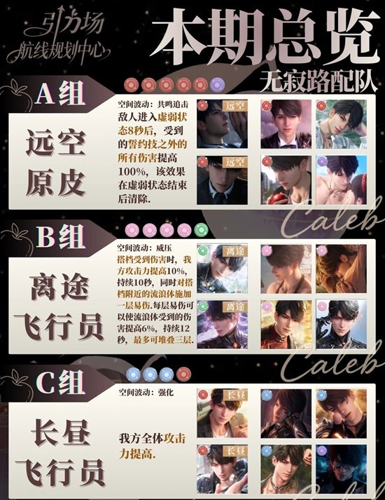 A组建议远空本体;B组较难,建议寂路本体,月卡上绿谱尽量对谱;C组较简单,可用长昼批皮寂路,果果们可以参照图文和自身情况来配队。