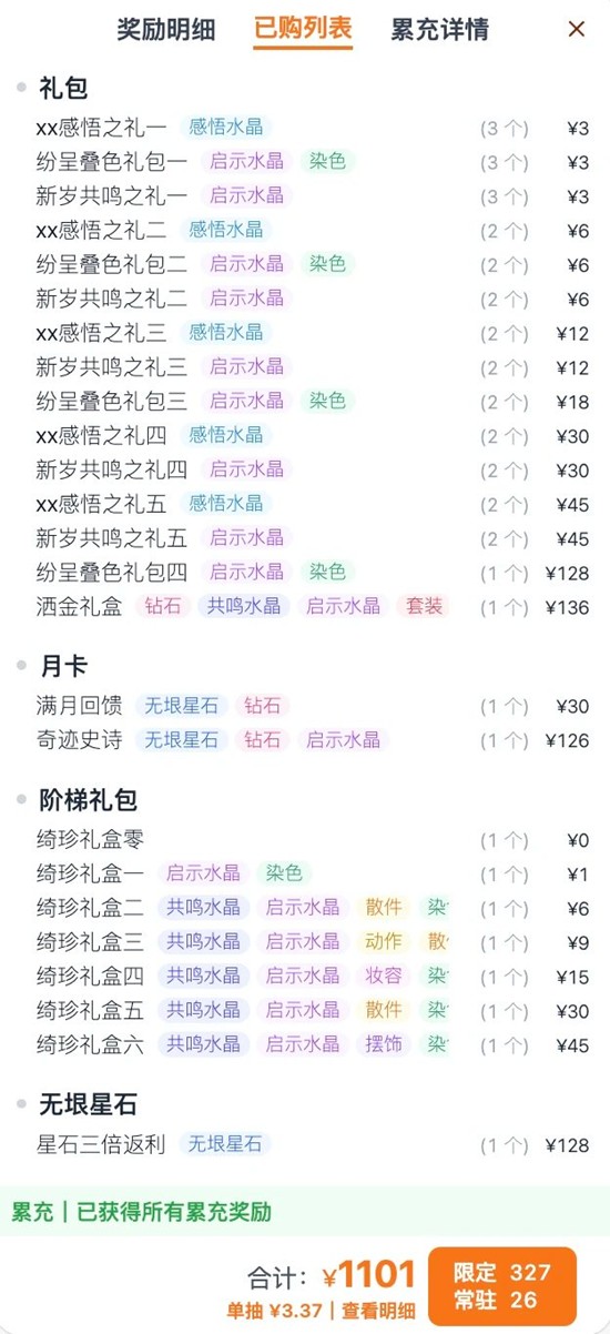 按照礼包列表,可以拿满累充奖励。加上版本免费的限定,一共能拿5120蓝钻加371抽,足够清空这个版本的商城了。(我就准备这么氪)