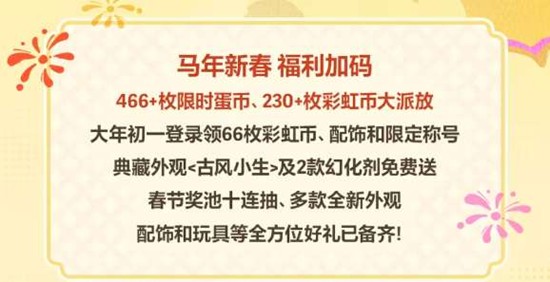 2月17日(大年初一):登录即领66枚彩虹币、2款典藏配饰及马年限定称号,仅限当天。