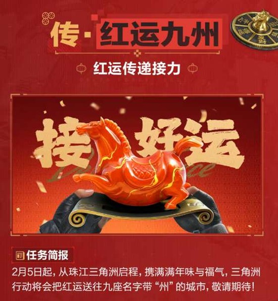 红运传递接力将于2月5日起从珠江三角洲启程,携满满年味与福气,三角洲行动将会把红运送往九座名字带"州"的城市,敬请期待。