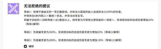 第二技能无法拒绝的提议会锁定当前敌方阵营中攻击力最高的单位,造成百分之二百四十攻击力的单体伤害,并为其附加持续六秒的魅惑减益状态。若目标身上的目眩神迷层数达到两层或以上,该技能将触发机制变更:所有主动技能造成的伤害提升百分之十,从而构建起稳定的伤害增幅循环。这种锁定高威胁目标的设计配合状态叠加,能有效压制敌方核心输出。