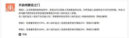 大招开启吧禁忌之门会释放一道黄金光线,对命中的敌人造成百分之三百五十攻击力的伤害,并在接下来的十二秒内使全体敌人持续承受伤害。同时赋予我方全体灿烂金光状态,使我方攻击附带额外增益效果,若在此期间成功击杀任一目标,则立即刷新全体敌人的灿烂金光持续时间。此外若洁依德担任队长,该技能有百分之五十的概率激活额外的队长效果:当队伍中精灵所属阵营与洁依德一致时,全队的攻击力、魔法恢复速度及体力上限均提升百分之五十。