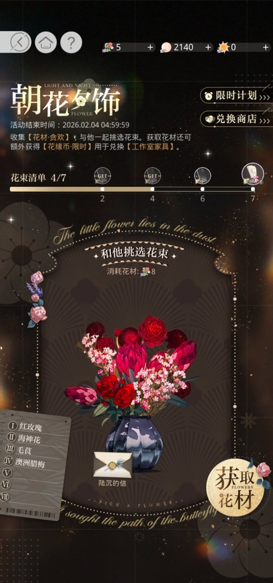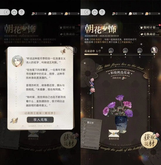 朝花夕饰是光与夜之恋羁梦花事绑定的男主专属限时活动,核心玩法为制作花束解锁互动奖励与工作室家具,同步可兑换许愿道具、限定家具等,适配情侣向沉浸体验,那么这一活动每日进度是怎样的呢?小编为你准备了一份攻略,一起来看看吧~