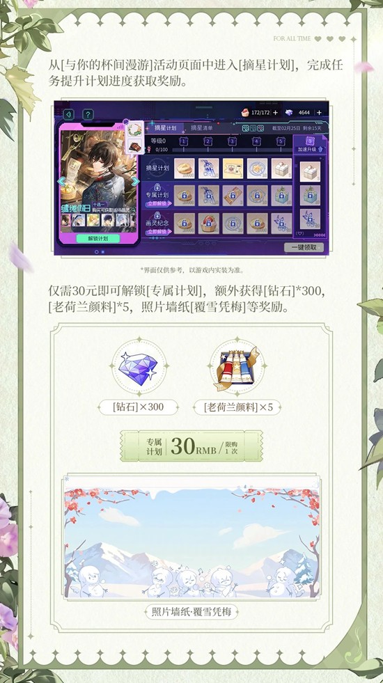 ► 解锁额外[专属计划],可获得[钻石]*300、[老荷兰颜料]*5、[照片墙纸·覆雪凭梅]等专属奖励。
