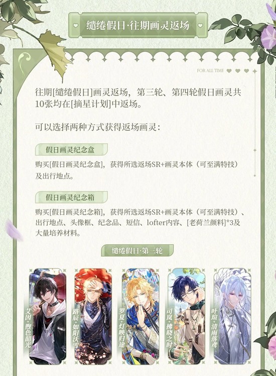 ► 在 [摘星计划]界面内,可购买[缱绻假日·第三轮][缱绻假日·第四轮]相关画灵返场,购买后需要完成[摘星计划]方可得到往期奖励。