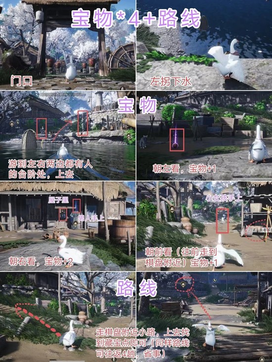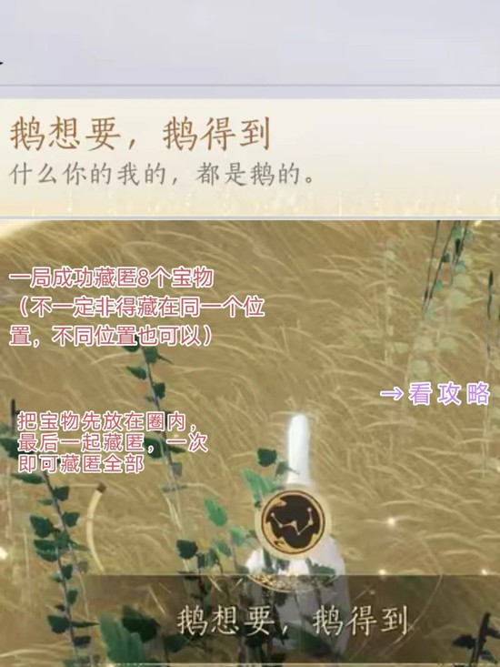 鹅想要,鹅得到:一局内成功藏匿8个宝物获得(时间充足的话搜刮一下路过的屋子、薅点路边的花花草草还能拿到困难成就“千里薅鹅毛”,顺带一个拿球成就“冲出清河,走向世界”)