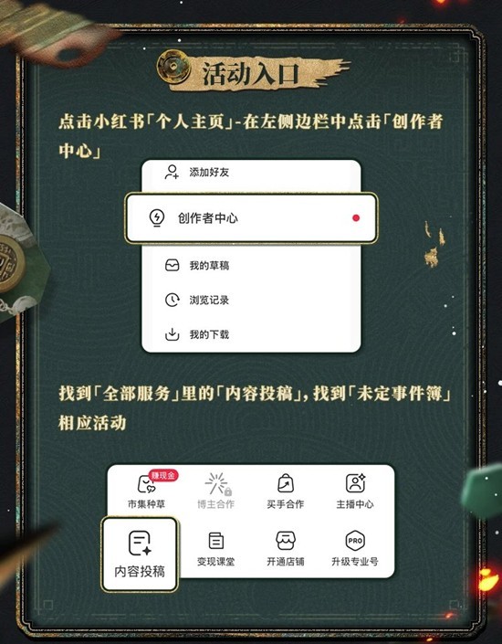▌活动入口:小红书「个人主页」-左侧边栏「三」-「创作者中心」-「全部服务」-「内容投稿」