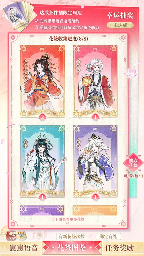 ※活动一共设置8种花签,大人们可以通过任务、祈愿、赠予来收集更多花签,聆听式神寄语。根据花签的收集进度,可解锁勾玉、四星奉为达摩、插画奖励。