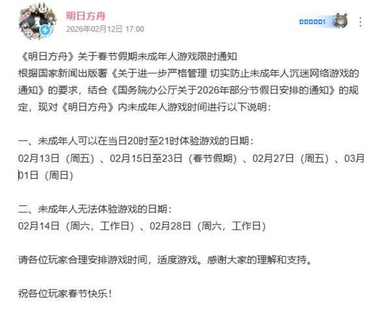 根据国家新闻出版署《关于进一步严格管理切实防止未成年人沉迷网络游戏的通知》的要求,结合《国务院办公厅关于2026年部分节假日安排的通知》的规定,《明日方舟》运营组于今日发布春节假期未成年人游戏限时通知,对未成年玩家的游戏时间进行详细说明。