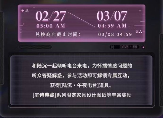 ① 和陆沉一起倾听电台来电,为怀揣情感问题的听众答疑解惑,完成全部节目录制后还可获得[陆沉・午夜电台]道具。