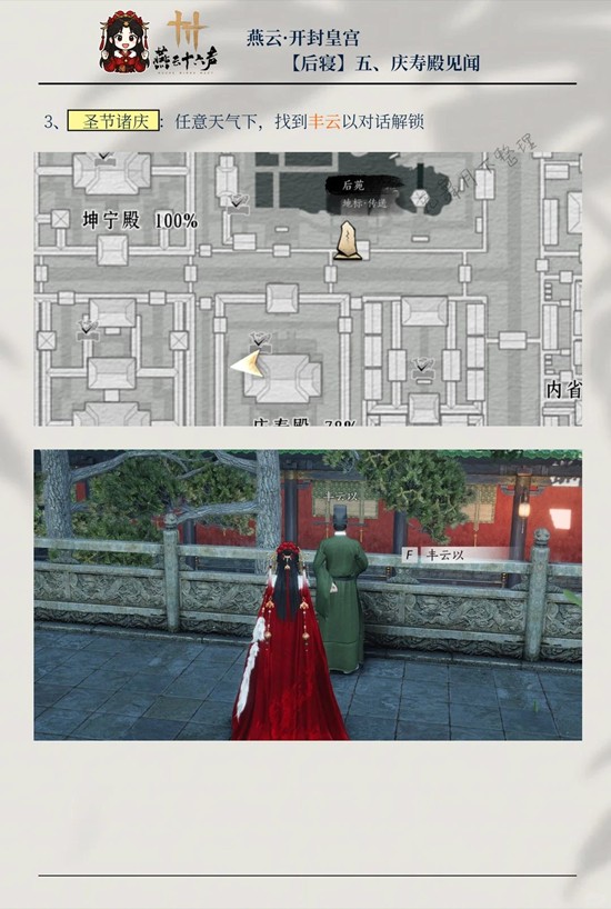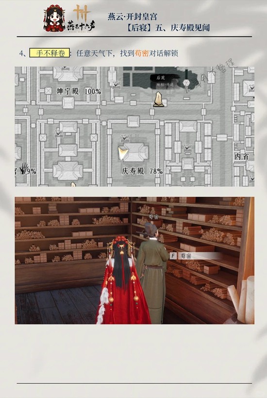 燕云十六声开封皇宫庆寿殿为皇宫后寝核心区域,共5 个见闻,含掌风吹拂、毋得进、奉圣节诸庆、乐礼重兴、手不释卷。需完成探游、与 NPC 对话、拾取物品解锁,搭配筑梦为牢万事知任务。完成可领剑纹、宝箱、阅历等奖励,小编为你准备了一份攻略,一起来看看吧~
