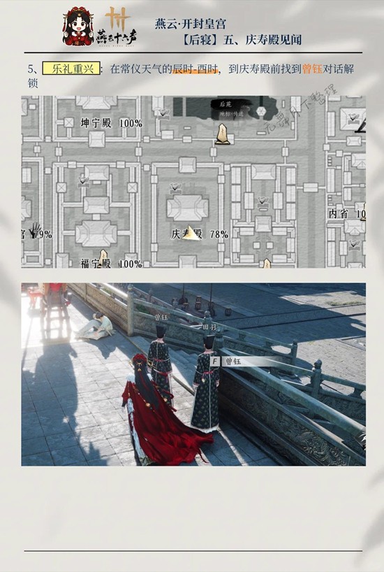 以上就是燕云十六声开封皇宫见闻收集攻略,庆寿殿5个见闻攻略的全部内容了,更多游戏资讯,攻略内容敬请关注切游网,您的支持是我们努力的动力!