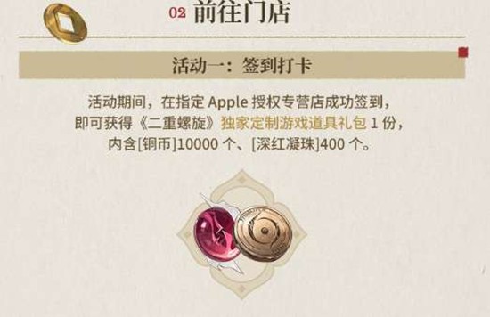 活动期间,在指定Apple授权专营店成功签到,即可获得《二重螺旋》独家定制游戏道具礼包1份(内含铜币10000个、深红凝珠400个),共计40万份,先到先得。