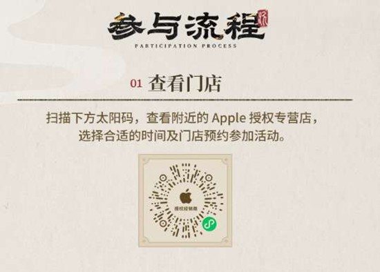 ※预约方式:搜索"Apple授权专营店"微信小程序,或扫描官方太阳码,即可查看附近门店并预约活动。