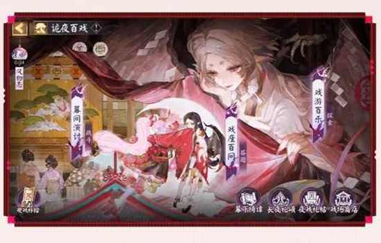 本次活动以传统百戏(杂技、戏曲等表演艺术)为灵感,结合《阴阳师》独有的妖怪美学,营造出"台上热闹正盛,台下妖魅横生"的强烈反差。红月当空之夜,看似寻常的百戏表演背后,似乎有某种不可名状的存在正在窥视——黑夜中潜伏的危机,需要阴阳师大人们亲自前往探查。