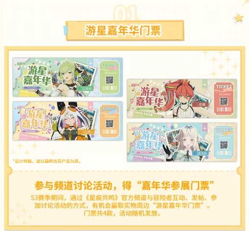 本次游星嘉年华共推出四款主题周边,涵盖门票、徽章、挂件与实用手袋,每一款都融入了《星痕共鸣》的人气角色元素,S3赛季期间,冒险者可通过《星痕共鸣》官方频道与社区积极互动、发帖、参与讨论活动,即有机会赢取实物周边"游星嘉年华门票"。门票设计精美,共包含四款不同样式,将作为参与社区共建的特别凭证。