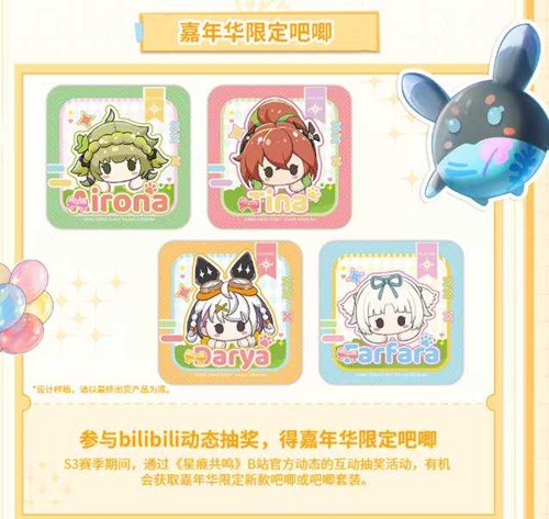 超可爱的Q版角色吧唧来袭!本次吧唧包含Airona、Sina、Darya、Sarfara四位人气角色的萌趣形象。冒险者可通过参与bilibili官方动态的互动抽奖活动,有机会获取嘉年华限定新款吧唧或吧唧套装。
