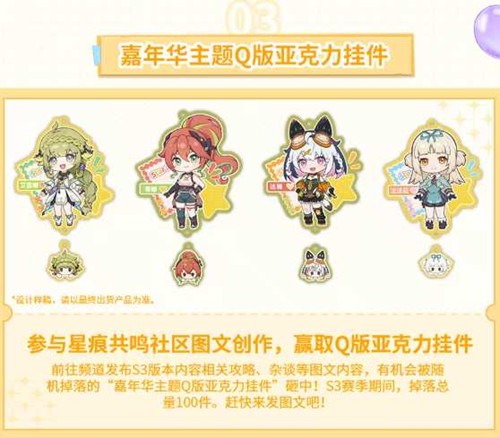 想要获得这套精致的Q版亚克力挂件?前往《星痕共鸣》社区发布S3版本内容相关攻略、杂谈等图文内容,即有机会被随机掉落的"嘉年华主题Q版亚克力挂件"砸中!S3赛季期间限量掉落100件,快来发图文吧!