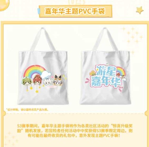 嘉年华主题PVC手袋实用的PVC手袋印有"游星嘉年华"主题图案,S3赛季期间将作为各类社区活动的"惊喜升级奖励"随机发放。若冒险者在中奖后的最终收货礼包中意外发现这款手袋,那就是官方送上的额外惊喜!