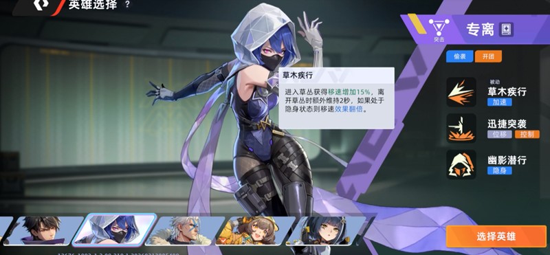 专离的技能体系围绕高速突进和战术潜行构建,被动技能【草木疾行】是她的核心机动性来源。当专离进入草丛时,会获得显著的移动速度加成,这个效果在离开草丛后还能持续2秒。如果在加速期间开启隐身,移速加成会直接翻倍,这让专离在地图上的穿梭和转场能力极为出色。一技能【瞬捷突袭】是一个集位移与控制于一体的关键技能,使用后专离会向前突进,并对身后扇形区域的敌人造成眩晕效果。如果成功穿越了敌方单位,这个技能会立刻刷新冷却时间,并且强化下一次攻击的伤害,这让专离在追击和连招上拥有极强的压制力。二技能【幽影潜行】需要短暂的引导,之后专离会进入长达15秒的隐身状态。隐身期间如果发动攻击或者过于靠近敌人,隐身就会解除。这个技能是专离执行偷袭、绕后和战术撤退的核心,尤其在团队配合中能发挥巨大的作用。
