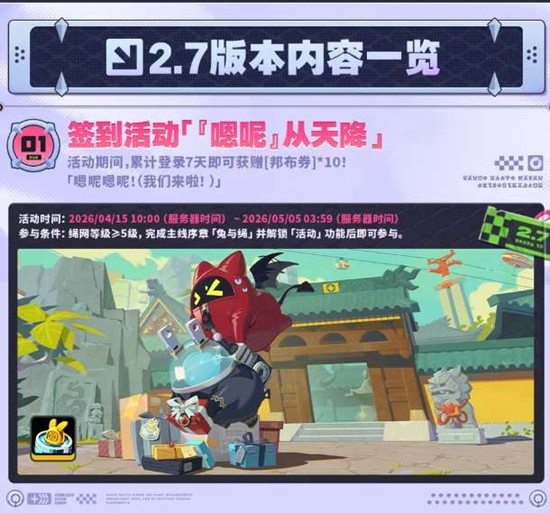 活动期间,累计登录7天即可获赠邦布券×10。嗯呢嗯呢!邦布们从天而降,为绳匠的冒险之旅增添助力。