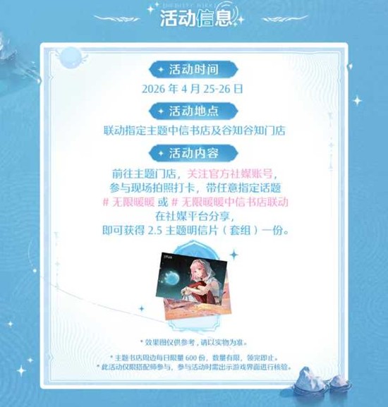 活动期间,搭配师前往指定主题中信书店或谷知谷知门店,关注官方社媒账号并参与现场拍照打卡,带话题#无限暖暖#或#无限暖暖中信书店联动#在社媒平台分享,即可免费领取2.5版本主题明信片套组一份。主题书店周边每日限量600份,数量有限,领完即止。