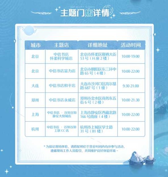 本次活动覆盖北京、大连、郑州、上海、杭州五座城市,共设六家主题门店:北京怀柔科学城店(10:00-19:00)、北京富力店(10:00-22:00)、大连和平店(9:30-21:00)、郑州永威店(10:00-21:30)、上海静安大悦城店(10:00-22:00)、杭州工联CC店(10:00-22:00)。