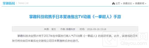 在《一拳超人》官方宣布将推第二季动漫和专属手游的同时,游戏的国内开发商也浮出了水面。掌趣科技在官网上宣布,将携手日本聚逸推出TV动画《一拳超人》手游。游戏将由掌趣科技自主研发,并于2017年在国内发行,而日本的发行则交由日本著名社交游戏公司日本聚逸株式会社进行。